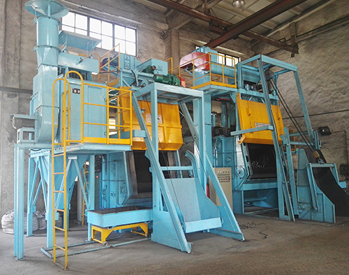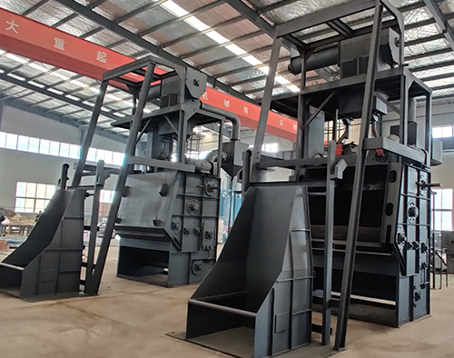 履带式抛丸机用橡胶履带形成的凹腔作为工件承载体。工作时,履带转动,带动凹腔内的工件翻滚,因此零件的内外表面均能获得较好的清理效果。该种机型分为手动和自动装卸料方式,最适合于大批量小型零件的抛丸清理。由于采用橡胶履带,减轻了工件与履带的撞击和划痕,并且占地面积小,操作极为方便,从而为众多厂家采用。