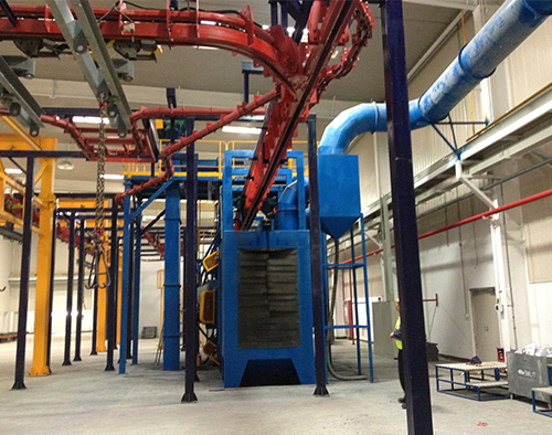 每台钩式抛丸机须经过切割、焊接、锻造、钩式抛丸机械加工、组装、喷漆、激光打标、调试检验合格后方可进入原厂入原厂。抛丸清洗机整体结构经员工老师熟练的焊接工艺施工后,厚钢板焊接后,安装房间内所有耐磨铸铁护板。